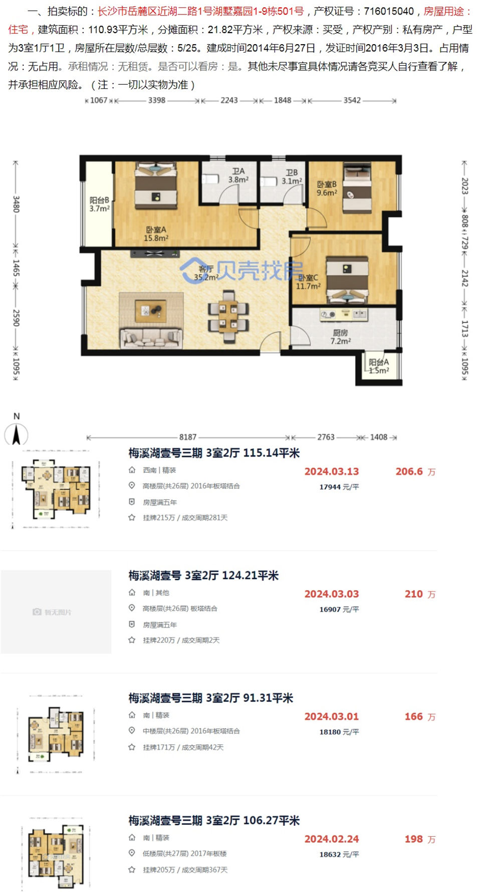 說下拍的房子,湖墅嘉園,也就是梅溪湖壹號(hào),111平,5樓,精裝修(有中央空調(diào)),三房?jī)蓮d兩衛(wèi),南北通透,采光還不錯(cuò),帶頂級(jí)雙學(xué)位,成交價(jià)161.8萬,折合成交單價(jià)1.45萬一平,二手房3月份貝殼成交記錄基本在1.8萬一平(如圖3),撿漏3500一平,撿漏近40萬。