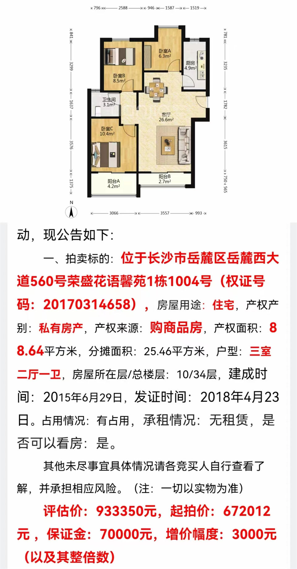 恭喜吳姐張哥撿漏榮盛花語(yǔ)馨苑(麓谷核心區(qū)域)法拍房一套,88平,67萬(wàn)成交,撿漏十幾萬(wàn),成交單價(jià)才7500元一平。