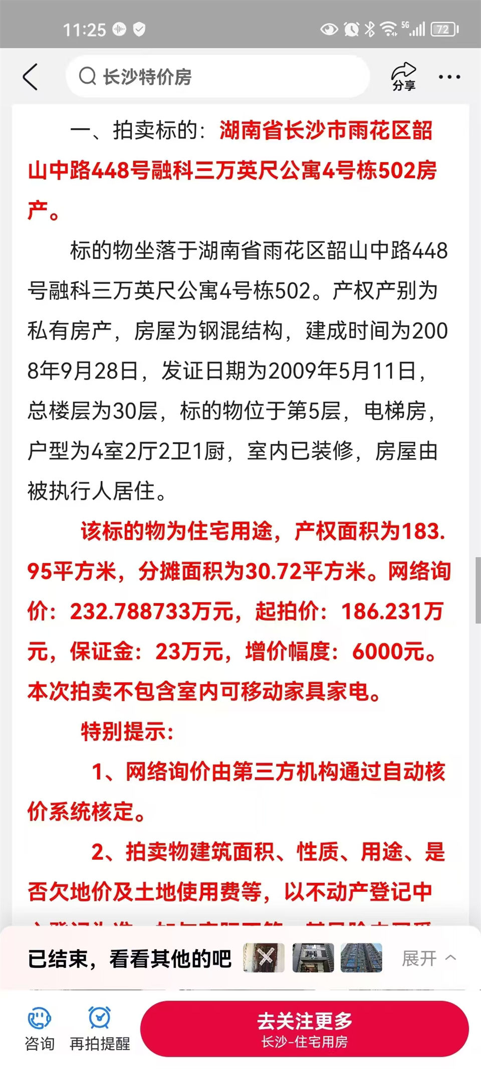 圖8、陳阿姨是我司湖南法拍網(wǎng)法拍房地產(chǎn)經(jīng)紀(jì)有限公司第197位VIP客戶,1月份簽約的(想買個(gè)湘雅附二醫(yī)院附近的房子),服務(wù)了整整10個(gè)月。推薦了多少房子,幫看過帶看過多少都記不清了,光有據(jù)可查調(diào)查報(bào)告都出了9套,回回緣分都沒到(其實(shí)陳阿姨很給力,有幾次參與二拍的房子,都超過一拍價(jià)了還在加,但就是沒緣分沒拍到)。就連融科三萬英尺這套中間一度因事不想?yún)⑴牧耍缇齽窳讼?,然后決定拍,結(jié)果緣分終于到了,二拍底價(jià)拿下了,直接撿漏50萬以上,太香了。