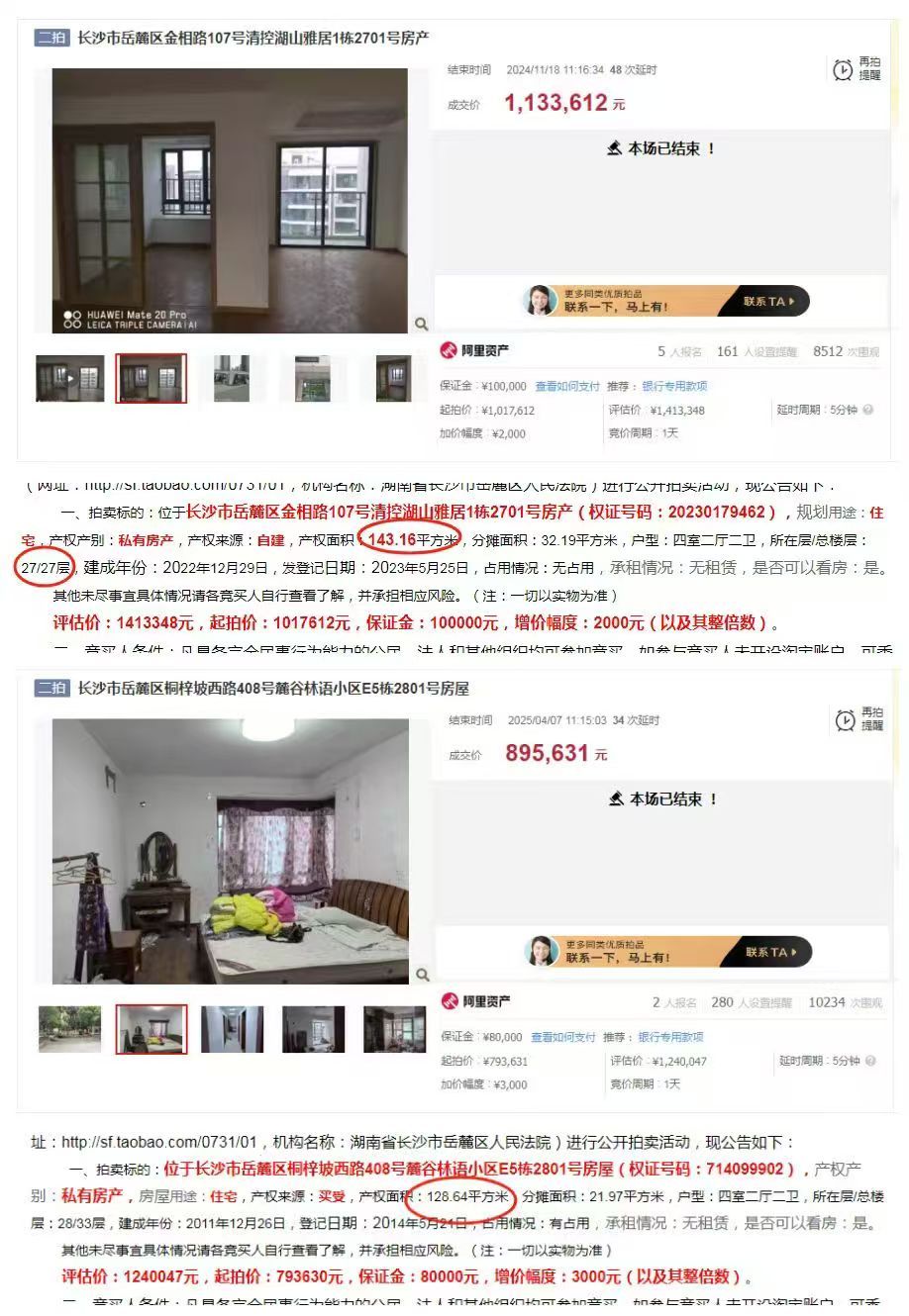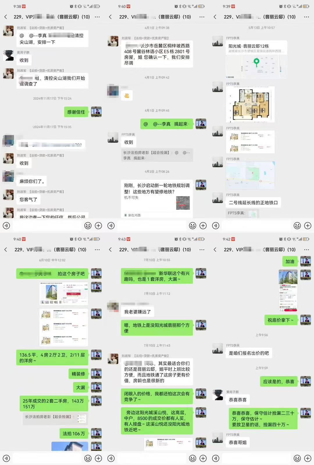 (圖9)萬(wàn)姐or吳哥是我公司(湖南法拍網(wǎng)法拍房地產(chǎn)經(jīng)紀(jì)有限公司)第229位VIP客戶,去年11月簽約的,當(dāng)時(shí)想拍清控尖山湖的一個(gè)143平的頂樓4房(圖8),結(jié)果出到113萬(wàn)沒(méi)拍贏,當(dāng)了回老二,還好沒(méi)拍贏(不然就沒(méi)這次洋房的緣分了)。然后中間又推薦了不少房子,又參拍了一套麓谷林語(yǔ)的房子(圖8),因?yàn)橛X(jué)得小區(qū)老,沒(méi)給太高預(yù)算,所以也沒(méi)拍贏(要拍贏了也沒(méi)洋房的緣分了)。然后6月份就等到這套洋房法拍房出來(lái)了,然后又正好找的專業(yè)法拍機(jī)構(gòu),能夠調(diào)查的清楚(要是跟其他公司簽約的,人調(diào)查完不建議拍,也沒(méi)辦法撿漏),敢兜底給客戶拍,所以就直接撿漏了。所以這就是客戶的緣分~